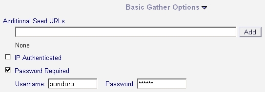 The bottom section is for the Basic Gather Options. Click on the right arrow button next to the Basic Gather Options and a window will be opened up for you to add any extra seed URLs, authentication and password details.