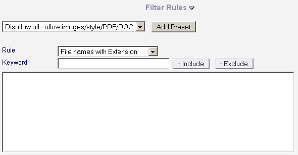 When setting filter rules you are offered the standard Rule and Keyword options (as appeared in PANDAS 2 and in HTTrack)