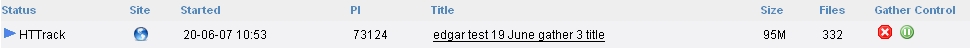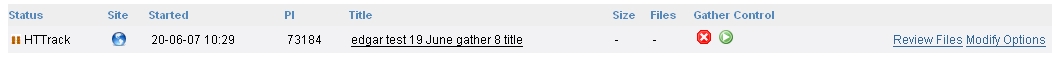 Note that pausing your gather will keep your title in the Gather Queue but will release the gatherer to pick up another title waiting to gather. When you have finished modifying or checking your gather and click on Restart, the title will still be in the Gather Queue but will not start actually gathering again until there is a free gatherer string. You will know when the gatherer starts re-gathering your instance as the Size and Files indicators will re-appear and begin to update.