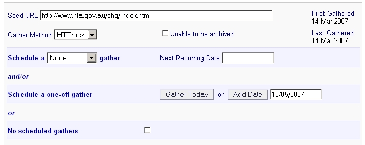 For a small web publication, you can submit a one-off gather request right away by clicking on the Gather Today button. The date in the date box is defaulted to today’s date. On clicking the Gather Today button, the date will be shown immediately underneath the date box. To delete the date, click on the - sign next to it. On saving the record with the date set, the title will appear in the Gather - Scheduled Titles Worktray and will be gathered as soon as there is a vacancy in the gather queue.