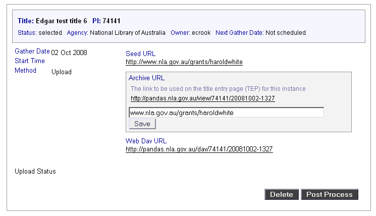 - Once you have added your files to the instance, back in PANDAS, select a start url and enter it in the Archive Url box provided. To do this overwrite any text that is in the box with your chosen file name string, remembering that you need only put in the gathered url string (i.e. if your start page is http://pandas.nla.gov.au/view/3000/20081002-0000/www.nla.gov.au/grants/haroldwhite/index.html you will only enter www.nla.gov.au/grants/haroldwhite/index.html).